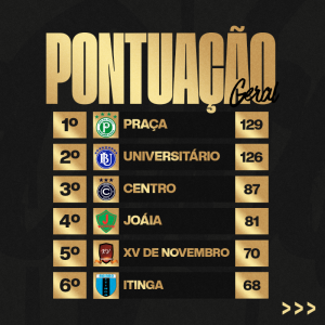 A classificação atual da XX Olimpíada Tijuquense revela um dos cenários mais equilibrados dos últimos anos. Com a proximidade do encerramento, apenas três pontos separam o líder do segundo colocado, colocando os bairros da Praça e do Universitário em uma perseguição direta pelo troféu de campeão geral.